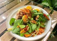 经过两小时炊煮的米饭,虾米、香菇的鲜美滋味在嘴里爆发,莲子烂熟入味、红椒粉使整体风味大大的提升。鸡蛋是来自南投竹山的放牧蛋,高品质且几乎无蛋腥味,而生菜种类有较少见的芝麻叶,加上坚果、蔓越莓乾、凤梨泡菜、腌小黄瓜……等,口味有层次又丰富,额外附上一碟胡麻酱,但个人认为沙拉搭配重口味的腌渍物就很好吃了~这款套餐还有搭配一碗味噌汤呦!