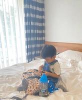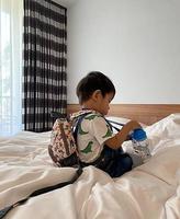 一直要自己背背包、背水壶。(想喝就喝不用跟大人拿)