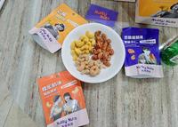 橘色的是蜂蜜奶油风味腰果、黄色的是芒果口味腰果、紫色的是香脆咸酥鸡风味杏仁