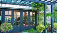 餐厅走的是欧风外观,整齐的玻璃格子窗配上蓝绿色的木质窗棂,外头架设的棚架任由藤蔓植物在上面攀爬,不知道的人还以为他是一家花店而不是一家餐厅。