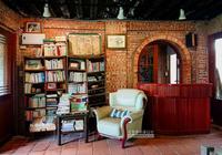 走进店里,红砖墙面的客厅、拱门前的吧台,歪七扭八的书柜藏着老书和一张单人沙发