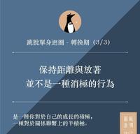 单身的原因真的千百万种,上次编编分享的万年单身回圈,最常发生在学生转换到社会人士的身份,或是你身处的环境已经变化了,你却还是在原地踏步的时候。 今天就单身回圈出发,来谈转换期的第一阶段罗! 开始前,编编先说个两段话: