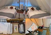 帐篷内部空间很大、有两张双人床、除湿机、毛巾、备品以及一张小桌子。
