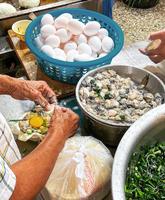 薄薄的面皮包入满满的韭菜跟冬粉馅料,接着放入肥美的鲜蚵,再打入一颗鸡蛋?