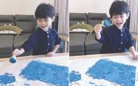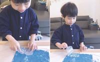 共读后我们一起用蓝色颜料来画北极的海水,并用气泡纸盖出休息的浮冰。