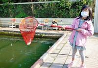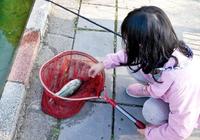 姐姐赶紧帮忙来解钩子.再将鱼儿放回池子里