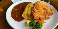 ?:店员表示牛肉酱蛋包饭+炸鸡排的组合保有开店以来的味道,是店家最推荐的餐点之一。蛋包饭的蛋味很香,虽然并不是半生的蛋,但整体也不会太硬,蛮好吃的。炸鸡排蛮大块,调味也很不错,但个人觉得有一点太柴了,比较不是我喜欢的口感。