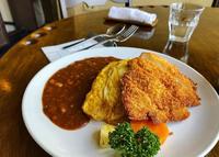 ?餐点:当天我点了店家推荐的牛肉酱蛋包饭+炸鸡排(ボルガライス,含税1500日币),并在店员的推荐下登录了店家的网路会员而获得一个免费的布丁。