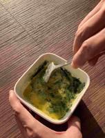 1.先把奶油微波融化2.再把蓝藻粉、鸡蛋、奶油、蒜末、葱花,搅拌均匀