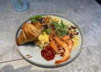 炒蛋跟薯饼都被虾子覆盖住,虾子真的好肥好大,而且不少只