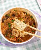 他们的蒜香真的非常厚实?店家把满满的蒜头跟青葱放在碗中,再淋上独门酱汁,搭配辣椒酱,真的很涮嘴?老板娘还说这个酱汁不管是拌饭或拌面都好吃,我本来还半信半疑,但吃下去之后,我信了!真的很下饭?