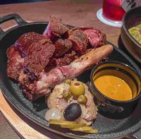这也是我第一次在餐酒馆吃串烧!以牛、鸡、猪、鲜虾、干贝来当作我们的开胃小点,而且每一个主食都有自己的酱料作搭配。牛肉搭配鲜甜的红酒酱、猪肉搭配塔塔酱、鸡肉搭配沙嗲酱、鲜虾干贝则是选用五香粉来提味。