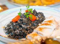 以中间硬、外层Q弹的⼝感属於七分熟的夹⽣饭制作而成,整体炖饭口感偏扎实,再配上墨鱼酱的淡淡咸香味,以及弹牙的新鲜中卷,是一道爽口且有嚼劲的料理。