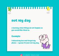"notmyday":abaddaywhenthingsdonohappenasyouwouldlikethemto很倒霉/倒霉死了Example:Imissedmybusandforgotmyphone-Iguessit'sjustnotmyday.没赶上公车,还把手机忘在家里,今天真的是很倒霉!