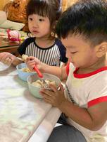 宝贝渐渐地想要有自主权,所以盯着小孩吃饭,只会造成他们压力,进而不喜欢吃饭。我们常说:进幼稚园后,小孩就会自己吃饭了。为什么呢?在幼儿园里,同侪们一起同桌吃饭,他们互相模仿学习。同理,在家一起同桌吃饭也是一个模仿学习的机会。