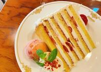 ?:这间的草莓蛋糕有在菜单上特别写「稍微大份」,但一上桌时仍被他的尺寸吓到,这根本不是「稍微大」呀......第一次看到跟脸一样大的蛋糕,觉得很震惊。蛋糕体本身很湿润,朋友表示口味像是古早家庭会做的紮实的草莓蛋糕,蛋糕体及奶油间还夹了覆盆莓果酱及草莓切片,酸酸甜甜的不错吃,不过真的太大份,朋友与我一致认为两人合吃一个比较合适,不然对於不嗜甜的人而言吃到最后会有些辛苦。而蛋糕旁的草莓冰淇淋则是很浓郁,配着蛋糕一起吃能稍微消除甜腻感。