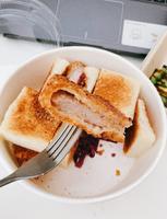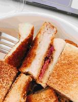 它的猪排三明治是切的小小块这种,光看照片我就爱上了,四方形吐司切面刚好可以一口吃,土司烤的微焦带软,吃起来很好入口,回家配华灯初上追剧边吃,一口接一口在喝个红茶,推罗?