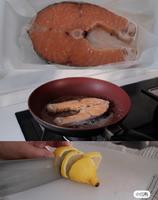 3、锅里倒油加热三文鱼下锅,中火加热三分钟左右,加入黄油,反面煎到自己喜好的程度,盛出来备有(如果是一面带鱼皮的,一定要先鱼皮朝下煎!)