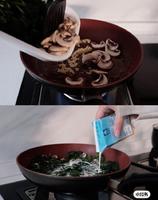 4、锅里加点油,大蒜煸炒香,加入蘑菇炒熟,倒入菠菜翻炒