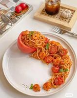 5、用番茄做个摆盘造型。番茄切掉盖,挖出番茄肉。用筷子将意面卷入番茄中,剩余的绕着绕这盘子放。撒上调味料即可