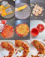 食材:番茄、番茄肉酱、意面、虾仁、圣女果、蒜末