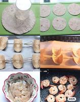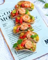4、最后取出烤好的饼皮,装上拌好的馅料,放上大虾即可