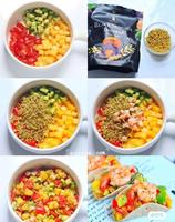食材:全麦饼皮两张、牛油果半个、芒果半个、小番茄、薯片适量、虾仁10个