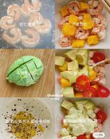 食材:牛油果、鸡蛋、芒果、大虾、小番茄、无糖酸奶、黄芥末酱、黑胡椒