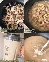 3、将白蘑菇洋葱连同汤汁放入料理机搅拌均匀