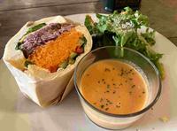 ?:烤牛肉三明治的馅很清爽,烤牛肉味道并不会太重,且搭配着腌渍红萝卜、小黄瓜、甜椒味道都十分平衡,唯一觉得不太喜欢的是面包有一点太乾了,可能因为三明治是先制作好后冰在蛋糕柜中,而非现场制作,可能有部分水份被冰箱吸收了。(烤牛肉三明治单点未税600日币)?:沙拉量并不多,酱也偏清爽,吃起来不会有负担。?:今天的蔬菜汤应该是红萝卜汤,喝起来很甜但不腻,非常顺口,温温热热的喝起来很舒服。