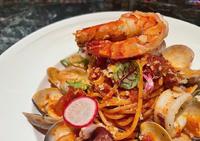 这个料得量很对得起它的价位,应该说是这里的每一道料理都很对得起它的价位R,我点的是海鲜义大利面不是蛤蜊义大利面,竟然也有蛤蜊围绕的待遇,红酱的茄汁很浓郁,再加面拌再一起都没问题(是多饿)。