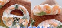 5、将春卷皮划分成四份,然后先铺魔芋和香菜在四分之二处,然后将你想要最终呈现在最顶层的食材(我这里是虾)放在四分之三处,然后手沾点水,先把两侧包起来,再卷好即可