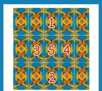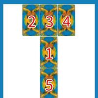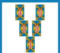 共需要抽出15张牌,从上至下,一排5张,然后翻开如下图的1~5号位置牌卡。1号代表「对方目前想法」,2号代表「自己目前状况」,3号代表「自己应对对方采取什么态度」,4号代表「两人目前的状况与阻碍」,5号代表「最终结果」。