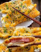 4、趁蛋液未凝固把鸡蛋部分盖在面粉糊部分上,中途翻面,煎到熟透即可!