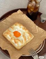 4.、用平底锅放入黄油热锅后,将蛋平铺在锅里,盖上锅盖用小火煎3分钟直到蛋冒泡