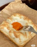2、打好的蛋清涂抹到吐司上,中间留一个洞,把蛋黄放到洞里