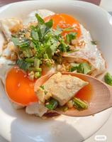 4、煎两个溏心蛋,铺在豆腐上最后倒上调制好的酱汁儿撒上灵魂香菜就可以开吃了!