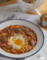 鸡蛋食谱推荐二十三:辣味香肠蘑菇茄汁溏心蛋炖饭