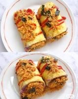 蛋饼上铺一层芋泥、一层海苔肉松,卷起定型