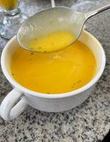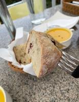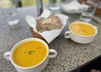 选择障碍的症状又发作了...最后点了乡村野菇炖饭、明太子鲜虾义式手做披萨,加价$100搭配A套餐,附手工面包、汤品还有饮料。这天提供的是南瓜浓汤,说实话不是我偏爱的口味,奶油味稍重,个人比较吃得到南瓜颗粒的那种浓汤。手工面包蔓越莓味超香,吃起来外皮偏硬,里面松软,算是中规中矩。