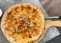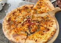 明太子鲜虾义式手做披萨热腾腾上菜,铺上满满的明太子、鲜虾,还有牵丝的起司,味道很浓郁,不过吃到后面会感觉有点腻;薄饼皮酥酥脆脆,很像饼乾的口感,最后剩下饼皮就没什么味道了QQ