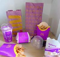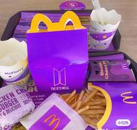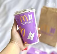 Tada!这就是BTSMeal的庐山真面目啦~原本的牛皮纸袋换上BTS的紫色应援色,薯条和汉堡看着都特别诱人!而饮料的更是有麦当劳和BTS联糸的logo,吃完后还可以当做收藏哦!到底这BTSMeal味道如何?我们一起期待BTSMeal于5月26日的上架吧!