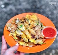 这里的蚵仔煎/蚝煎也是每座可见的小吃!在微焦的鸡蛋中仍能明显的看到鲜嫩肥美的蚝,看着就饿了啦!