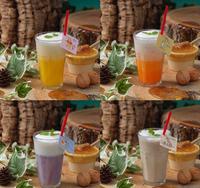 另外还有各种不同口味的优格饮品供选择,依照角色做不同的口味颜色设计,有黄色小熊维尼蜂蜜、橘色兔子瑞比苹果胡萝卜、紫色屹耳葡萄、袋鼠小荳、妈妈拿铁。