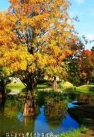 虎尾落羽松最大的特色,就是水上落羽松,抬头就是红色、黄色、绿色交织的落羽松,二、三十几棵的落羽松一片被波光粼粼的水环绕,水中可看到落羽松的倒影美景,落下的叶子就如同红色的羽毛在水中浮动,水中还有鱼群游动,站在水面小丘上拍照简直就是婚纱等级的景点。