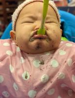 打完预防针的隔天,我就兴冲冲的煮了十倍粥(米1:水10)喂她,她完全不知道要怎么吃,既不知道要张嘴,也不会用上唇将食物刮进嘴巴,一半的粥在外面,一半不会吞所以跑出来,应该是几乎没有吃进去,我和老公觉得没趣就把粥收起来了?再喂她是两天后,我自己喂她,我一边吃着我的中餐,一边喂她,想到我可以示范给她看。我夸张的张大嘴巴并将汤匙送入,再闭紧留食物在嘴巴,夸张的咀嚼再夸张的吞下,她看得聚精会神?,但还是做不出来,不过食物看来是有吞下去了,因为隔天的便便已经变粘稠了。