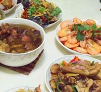例子A:"我刚刚吃饱了,妈妈煮了一桌的拿手好菜!"