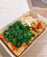 外带回家后,可能因为闷着的一小段时间造成水气闷住豆腐,导致外层没有现炸那种很脆的口感?臭豆腐果然还是经不起外带的考验啊~