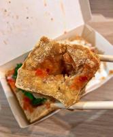 忍不住偷吃一块,刚炸好臭豆腐外酥内嫩的口感吃起来很爽,剩下的臭豆腐就赶紧外带回家继续享用啦~