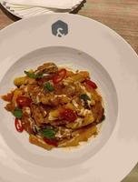 面疙瘩跟一般的印象不太一样,样子相当特别,长度细度适中,口感吃起来相当有嚼劲,山羊起司的味道淡淡的有达到提味效果。